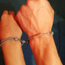 Such a cute simple couple bracelet. The size is adjustable and it’s super comfy. I even swim with it on and have no issues. It does stick to everything magnetic, but I find it kinda fun!