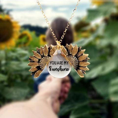 The sunflower locket opens up to reveal the loving words “You Are My Sunshine”